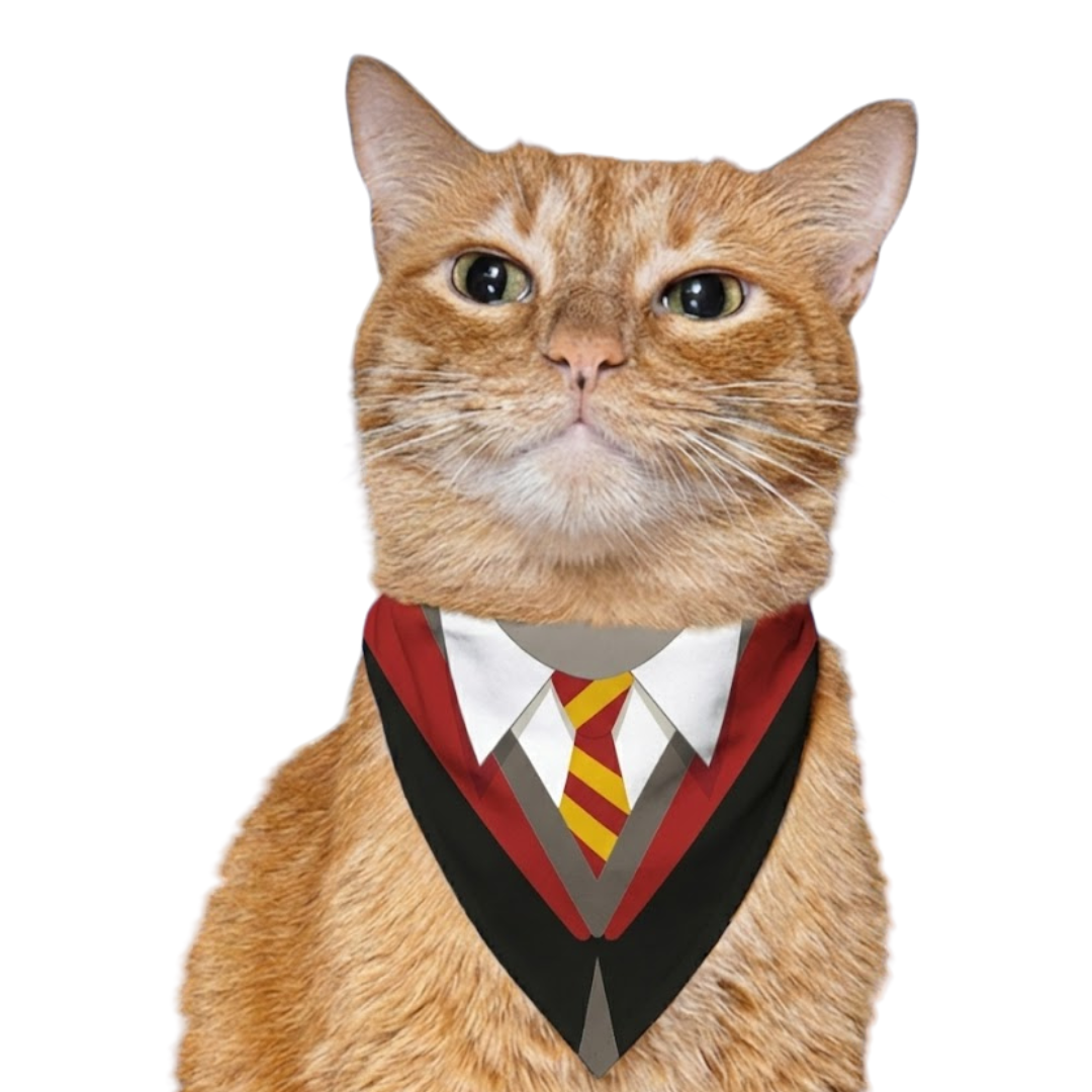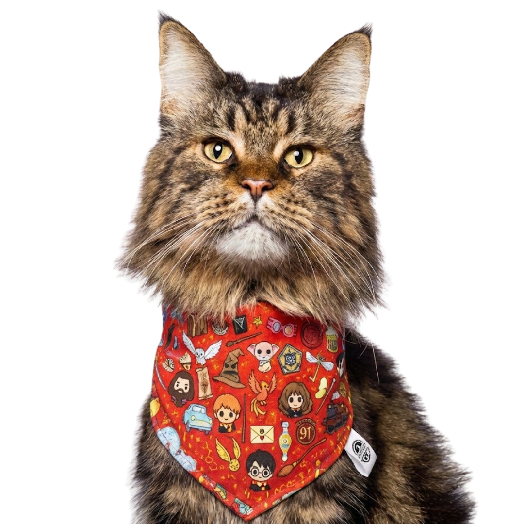 ¿Tu peludo tiene alma de mago? Esta pañoleta doble faz es perfecta para acompañar sus aventuras con un toque encantado. Por un lado, encontrarás un diseño lleno de ilustraciones mágicas: personajes, criaturas, objetos y símbolos del universo de Harry Potter en un fondo rojo vibrante que roba miradas. Por el otro, una simulación de uniforme mágico con corbata ilustrada que lo convierte automáticamente en un estudiante del colegio de magia más famoso del mundo. 🎓⚡