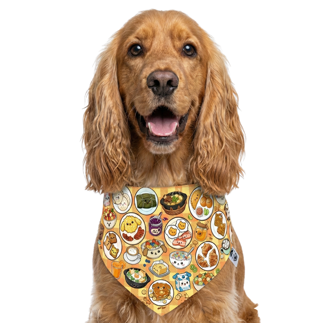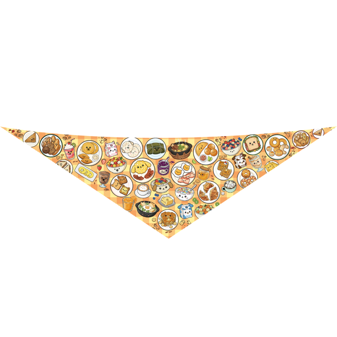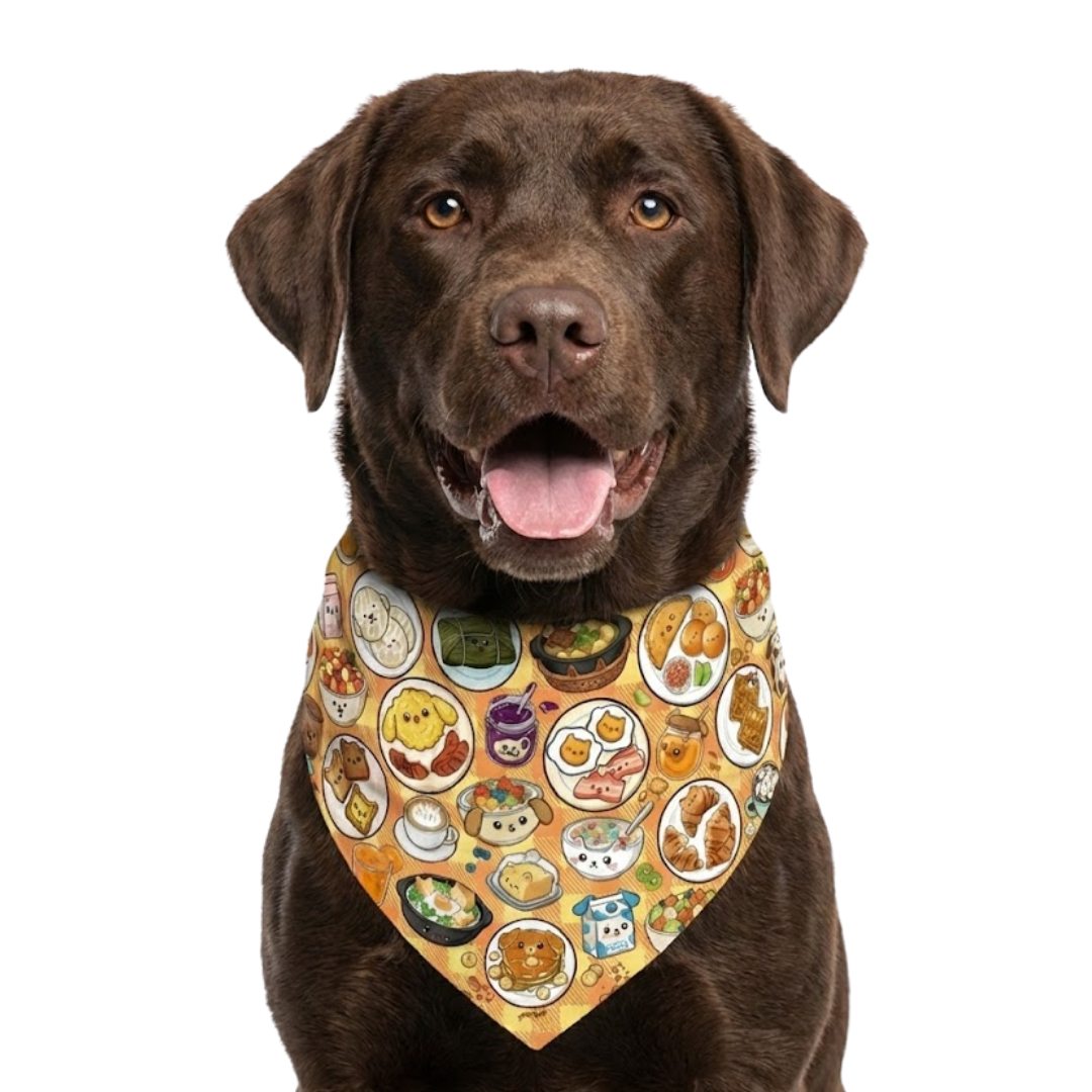 ¿Tu peludo es de los que madrugan con energía o se queda en modo cobija? Esta pañoleta doble faz es perfecta para acompañar sus mañanas con una dosis extra de ternura y sabor. Verás un diseño lleno de delicias ilustradas: tostadas, croissants, cereales, empanadas, tamales, frutas y pancakes… todo transformado mágicamente en perritos y gatitos, que parecen recién salidos de la cocina más feliz del universo. Todo sobre un fondo a cuadros amarillo y naranja que recuerda a un mantel de picnic cálido y casero, perfecto para compartir.