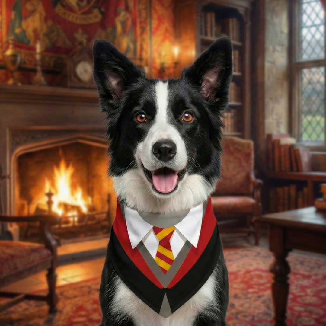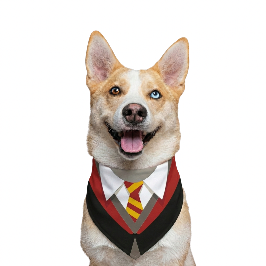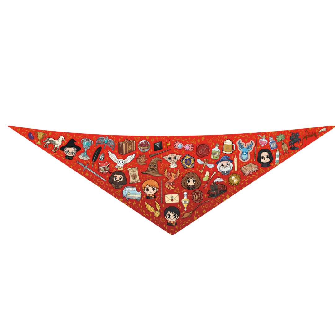 ¿Tu peludo tiene alma de mago? Esta pañoleta doble faz es perfecta para acompañar sus aventuras con un toque encantado. Por un lado, encontrarás un diseño lleno de ilustraciones mágicas: personajes, criaturas, objetos y símbolos del universo de Harry Potter en un fondo rojo vibrante que roba miradas. Por el otro, una simulación de uniforme mágico con corbata ilustrada que lo convierte automáticamente en un estudiante del colegio de magia más famoso del mundo. 🎓⚡
